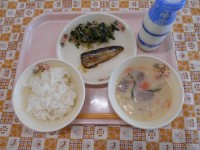【今日の献立】 ・牛乳 ・バンズパン ・煮込みハンバーグ ・ゆで野菜 ・冬野菜のあったかスープ