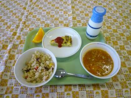 パエリアは、お米と野菜や魚介類をスープで炊き込んだ代表的なスペイン料理です。 給食ではイカとタコがはいっていますよ。