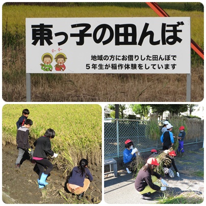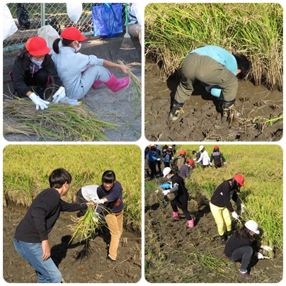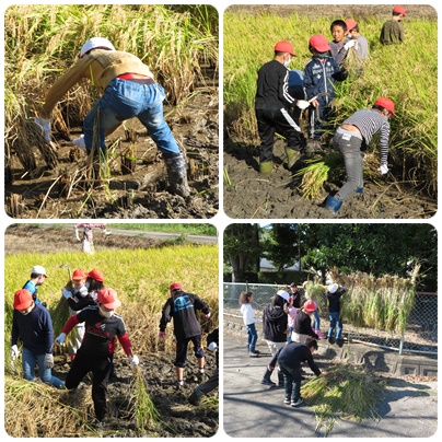 5年生は、毎年総合的な学習の時間に、「ESD(持続可能な開発のための教育)」の一環として、米作りを行っています。本年度は、臨時休業が終わった6月に田植えをし、地域のボランティアの方の助けも借りながら、世話をしてきました。その稲が、「実りの秋」を迎え、10月20日(火)の午後に稲刈りを行いました。子どもたちはぬかるんだ泥に足を取られながらも、収穫の喜びを味わっていました。今後は、脱穀などの作業も体験します。「米作り」の学習は、まだまだ続きます。