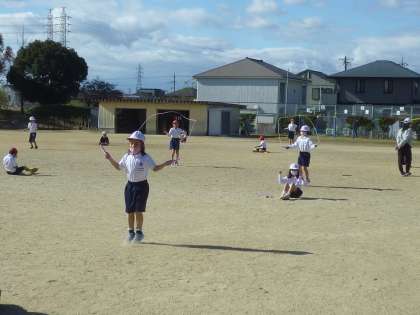 1年生の体育の時間です。1組は運動場でなわとびにチャレンジしています。風が強くなってきたけれど、何回とべるか挑戦中。