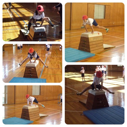 2組は体育館でとびばこにチャレンジ。助走から手をつく位置に気を付けて上手にとびこしています。