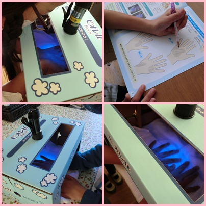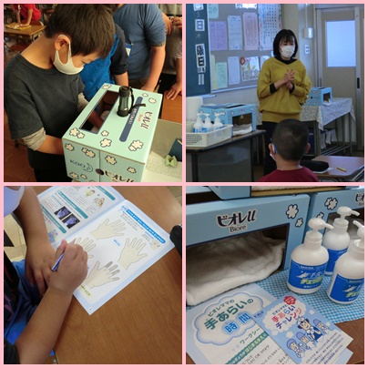 3年生の「たのしいほけん」の授業で手あらいの学習をしました。手あらいチェッカーで自分の手あらい後の汚れについて確認しました。つめやつめと指の境目、指の付け根、親指に汚れが残っている児童が多くいました。毎日、いっしょうけんめい手あらいをしているので、あらい残しがあることにびっくりしている児童もいました。みんなで、手あらいの仕方をもう1度確認しました。栄養士の鈴木先生から、給食を作っている調理員さんの手あらいについても話を聞きました。つめブラシを使い、何度も何度も、手を洗いながら給食を作ってくださっているそうです。