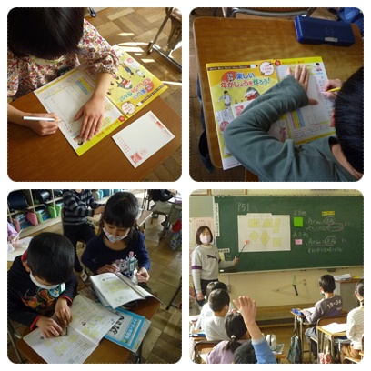 1組では年賀状を書く学習をしていました。まずテキスト使って練習して、本物の年賀状に清書していきます。