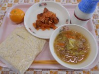 【今日の献立】 ・牛乳 ・ご飯 ・さばの銀紙焼き ・ゆかり和え ・のっぺい汁 ・玄米まんじゅう