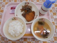 今日のパンは、あいちの米粉入りです。いつものパンよりもちもちした食感でやわらかいパンです。れんこんサンドフライは、シャキシャキした歯ごたえで、カレー風味。スープにはもち麦が入っています。野菜たっぷりのおいしい給食を食べて、午後もしっかり学習しましょう。