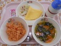 【今日の献立】 ・牛乳 ・白飯 ・鶏肉とれんこんの揚げ煮 ・ふだま汁 ・りんご
