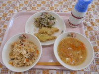 【今日の献立】 ・牛乳 ・麦ご飯 ・ポークと豆のカレー ・ひじきのマリネ ・プルーンヨーグルト