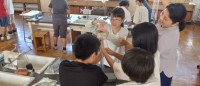 5年生は、図工の授業で「ほり進みNEO版画」を作製しています。ほり進み版画は、1枚の版画板を数回に分けてほり進み、その都度、色インキで重ね刷りをしていく1版多色刷り版画です。カラフルな作品が仕上がりつつあります。