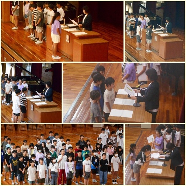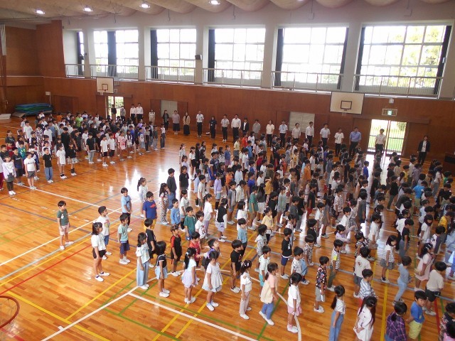 表彰伝達のあと、前期の終業式を行いました。節目の時期ということで、校長先生から3つのことを振り返りましょうというお話がありました。「あいさつ」「思いやり」「伝える」の3つについてです。「だれにでも挨拶できたかな」、「相手が嫌な気持ちになる言葉でなく、温かい言葉を使うことができたかな」、「自分の考えや気持ちを自分の言葉で伝えることができたかな」など、それぞれ自分はどうだったかを振り返りました。