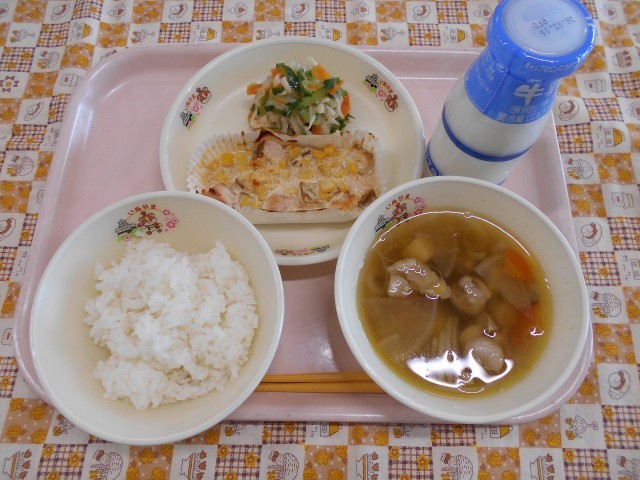 丼物になると、いつもよりご飯をたくさん食べられるという子が多いです。今日は焼き肉丼でした。タンパク質を取って元気もりもり、午後からの授業も頑張れそうです。キムチスープは、野菜がたっぷり入っていて、ピリ辛で温かく、体がポカポカしてきました。