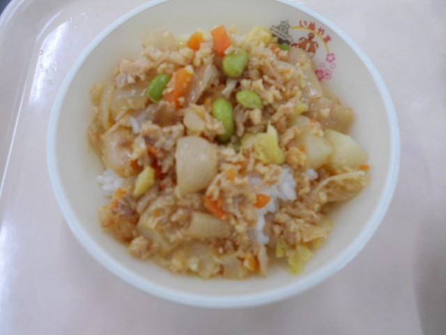 丼物になると、いつもよりご飯をたくさん食べられるという子が多いです。今日は焼き肉丼でした。タンパク質を取って元気もりもり、午後からの授業も頑張れそうです。キムチスープは、野菜がたっぷり入っていて、ピリ辛で温かく、体がポカポカしてきました。