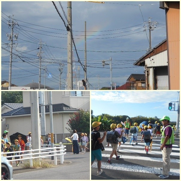 今朝は、市内一斉に「交通安全地域総ぐるみ街頭大監視」が行われました。地域の方々とも元気よく挨拶を交わしました。空には虹が出ており、子どもたちはさらに笑顔になり、素敵な架け橋を見ることができました。正門では、代表委員が元気な挨拶ができた子にポイントカードを配っています。全校でこのポイントをためていきます。たくさんたまると、東丸くんの姿に変化が・・・それはお楽しみです。