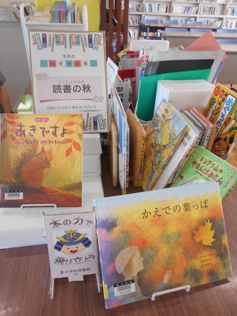 図書館の掲示板は紅葉し、10月号の図書館だよりが掲示してあります。ブックママの方々が作成してくださいました。また、カウンターの横には、市立図書館の司書さんが「読書の秋」コーナーに秋を感じる本をいくつか用意してくださいました。まだ見ていない東っ子は、ぜひ図書館に足を運んでくださいね。