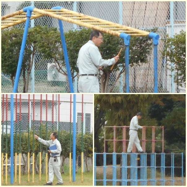 みんなの使う遊具の点検日です。安全に遊ぶことができるかをチェックするために、定期的に来ていただいています。