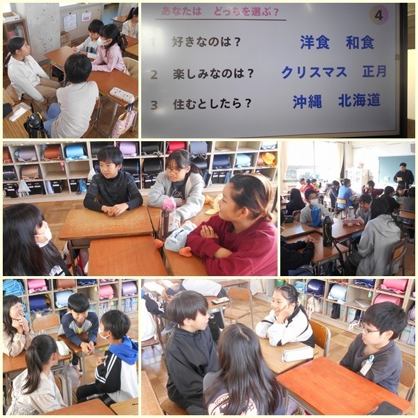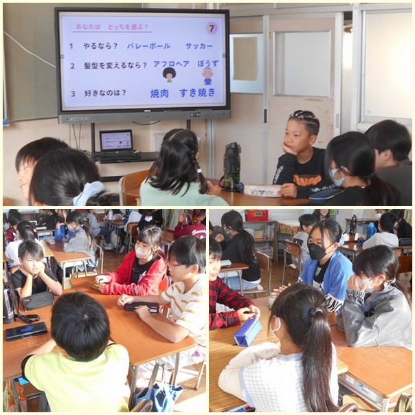 毎週、かかわり活動「ハピスマタイム」を行っています。友達と楽しくかかわり合いながら、自然にあいさつやうなずきができる、みんなが笑顔になる活動です。ポイントは友達や先生の話をうなずいて聴くことです。今日は「二者択一」で、どちらかを選び、好きな理由を答えます。相手の話をよく聞いて、フリートークの時間になったら、友達に質問します。話す側も相手に伝わるように、聴く側もていねいに聴くことが大切な活動です。
