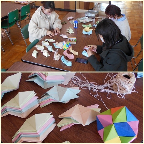 図書館の飾りづくりをしてくださいました。春色の色紙を使って立体を組み立てています。できあがりが楽しみです。