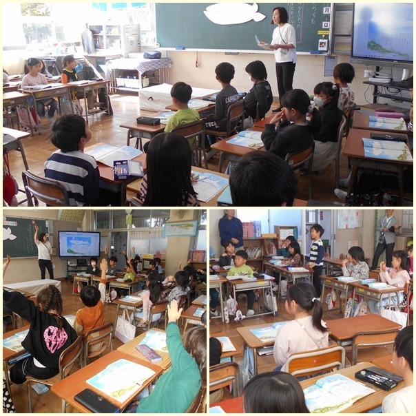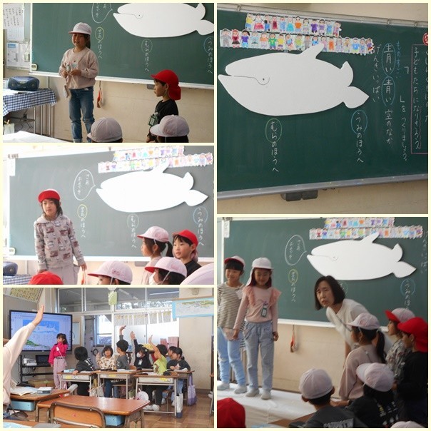 「くじらぐも」の学習です。くじらぐもに乗った子どもたちはどんなお話をしているのだろうか。想像してなりきって演技をしていました。遠くの方に何か見えたかな。みんな音読も上手にできました。