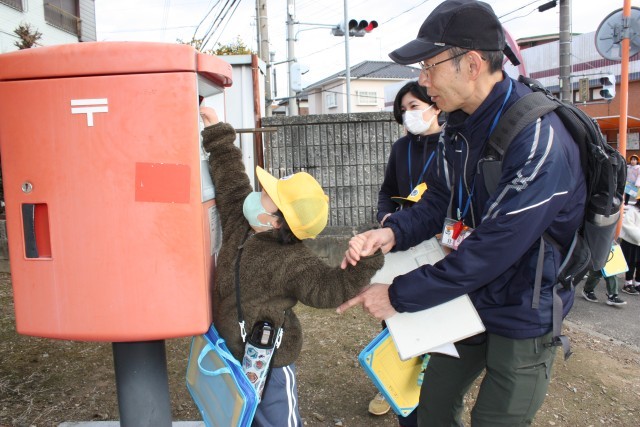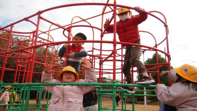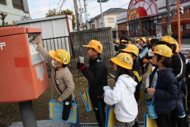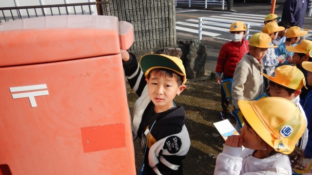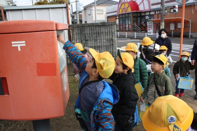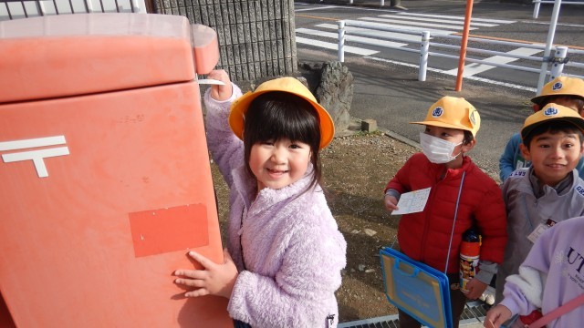 自分たちで書いた年賀状をポストに投函しました。ポストに入れるときには、無事に届きますようにと願いを込めて入れました。帰りには公園により、寒さに負けることなくおもいっきり遊ぶことができました。