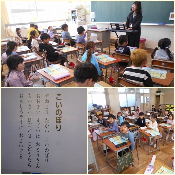 音楽では歌を歌っています。今日はこいのぼりを元気よく歌っていました。また、鉛筆を正しく持って線をなぞったり、色を塗ったり、何をするのか担任の先生の指示をしっかり聞いて落ち着いて取り組んでいました。