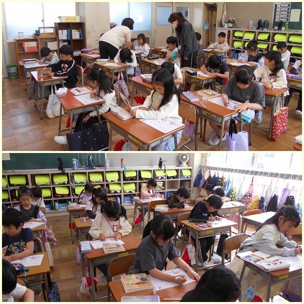 1年生は算数のテストに取り組んだり、カタカナの練習をしたりしていました。テストは自分の力でチャレンジします。静かに自分で読んで問題を解くことにずいぶん慣れてきました。