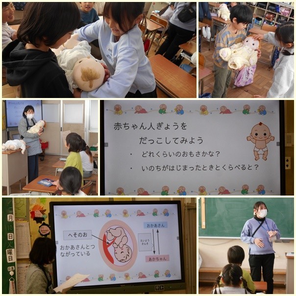 養護教諭による生命の授業が行われました。赤ちゃんはどうやって育つのかな? どのくらいの重さなのかな? お母さんのおなかの中で飲んだり食べたりできるのかな? 最初はどのくらいの大きさなのかな?などなど、赤ちゃんが誕生するまでの様子について学びました。大事に赤ちゃんを抱っこしたり、その重みを感じたり、へその緒の役割を知って納得したり、それぞれに学びのある時間となりました。最後にゲストティーチャーとして、妊婦の先生にも登場してもらいました。赤ちゃんの体とつながっているので、今は、赤ちゃんにとってよくないものは食べたり飲んだりしないで我慢しているとお話しされました。