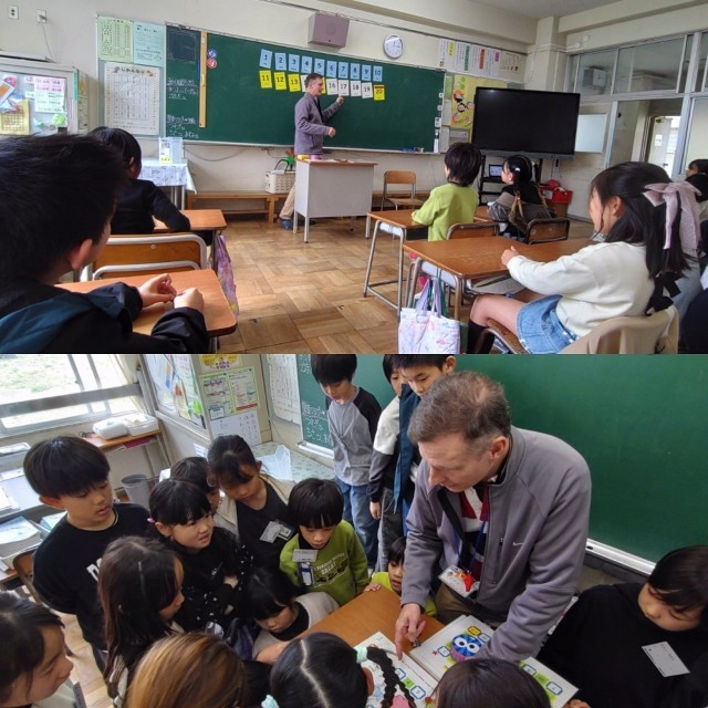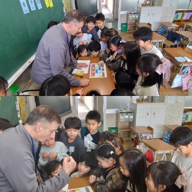 マイク先生による外国語活動の様子です。1~20までの数字を英語で言ったり、すごろくゲームを使って学習を進めたりしていました。