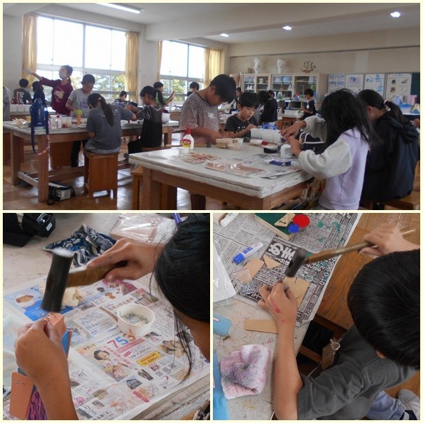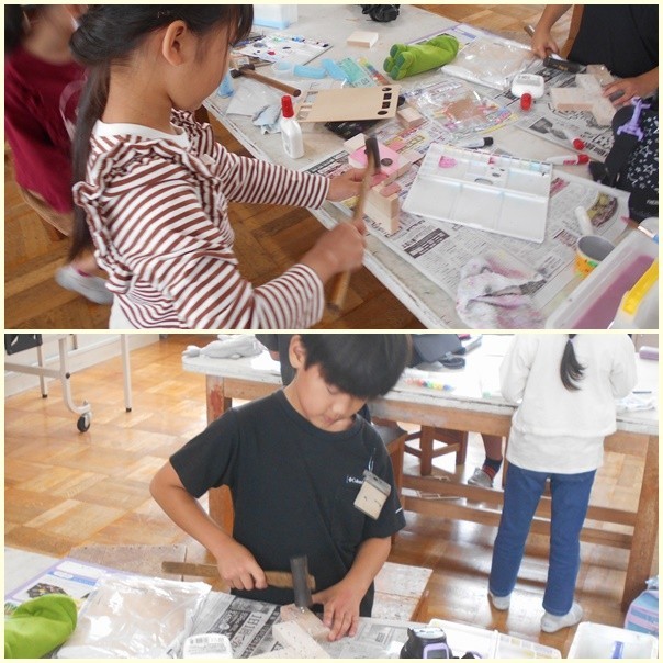 金づちを使っていました。ケガをしないよう注意しながらくぎ打ちをしています。まっすぐ打ちたいのに斜めになってしまったり、深く打ち込めなかったりと苦戦している子もいましたが、だんだん上手になってきます。さあ、どんな作品ができるかな。