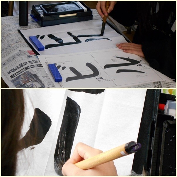 手本は、カタカナで「ビル」です。この一年で、習字道具の扱いにずいぶん慣れてきました。また、筆の運び方も習得しつつあります。特に、始筆はきれいに筆先を整えて、墨の量にも気をつけます。画数が少ないとバランスを取るのが難しくなることもありますが、手本を見て落ち着いて書こうとしている子がたくさんいました。