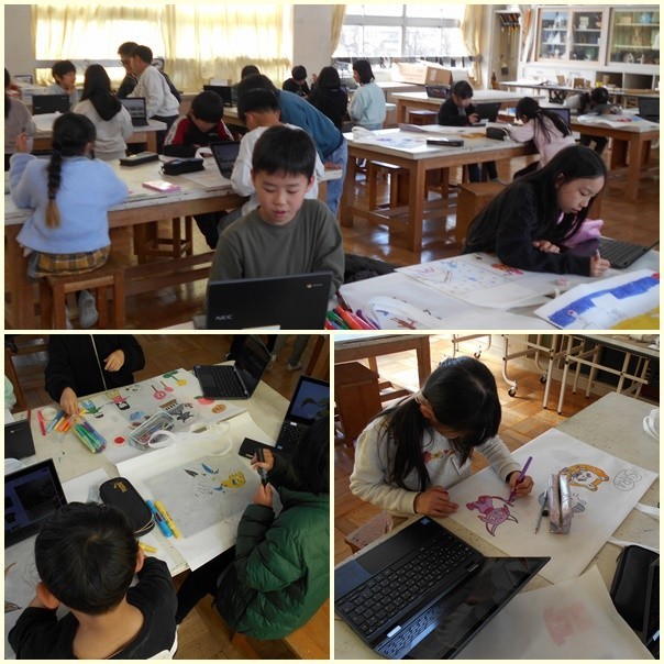 総合的な学習の時間です。発表するときに使うスライドと読み原稿をタブレットで作成していました。必要な図や写真を取り込み、それに合った文章を考えて入力します。ローマ字入力もまだまだ慣れていないので大変ですが、みんな集中して取り組んでいました。分からないときや困ったときは、先生や友達に相談したり、教えてもらったりします。