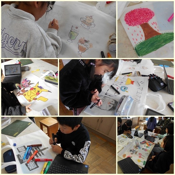 図工の作品を持ち帰るための作品入れバッグに絵を描いています。自分の好きな絵を描いていました。お気に入りのキャラクターなども見て描いているのですが、なかなかクオリティが高く、色塗りもきれいで上手に仕上げていました。
