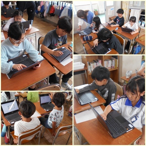 総合的な学習の時間です。発表するときに使うスライドと読み原稿をタブレットで作成していました。必要な図や写真を取り込み、それに合った文章を考えて入力します。ローマ字入力もまだまだ慣れていないので大変ですが、みんな集中して取り組んでいました。分からないときや困ったときは、先生や友達に相談したり、教えてもらったりします。