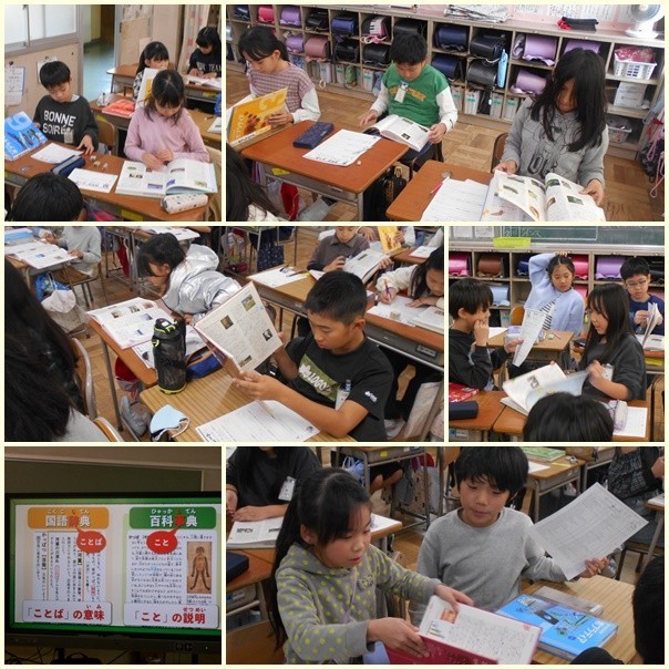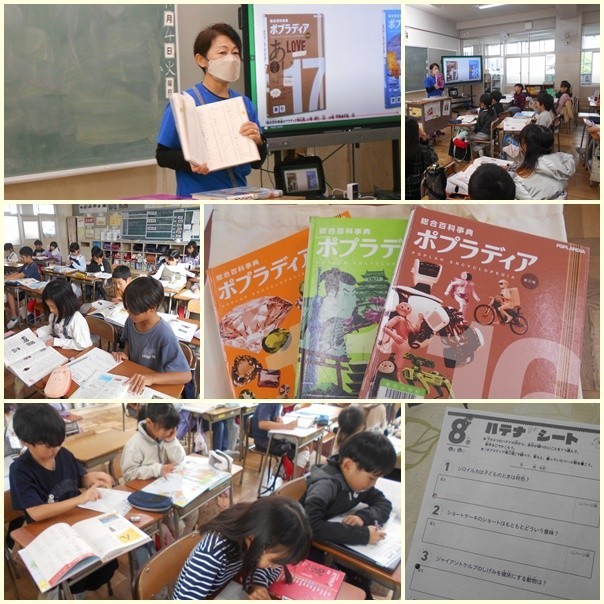 4年生がポプラディアの使い方を学習しました。学校司書さんによる授業です。ハテナシートの問いに答える形です。どのページに載っているかを探して、そこに書いてある内容を自分で読んで問いに対する回答を書いていきました。探し方のルールが分かれば、必要なページを見つけることができます。自分が今日使っていないシートも掲示されるので、他のシートにもチャレンジしてほしいと思います。