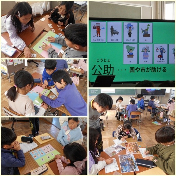 社会科の授業研究が行われました。自助・共助・公助についての学習です。災害が起きたときにどんな助けが大切であるかも考えました。グループで活発に意見交換ができました。
