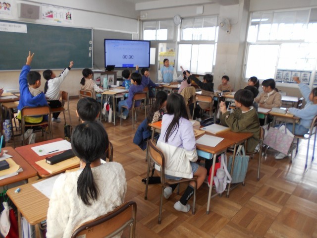 大事な公式を覚えていました。最後は、ペアでじゃんけんをして、勝った方が正方形か長方形のどちらかの面積を相手に答えてもらうというルールで、公式の確認をしていました。黒板を見ないで答えている子がたくさんいました。