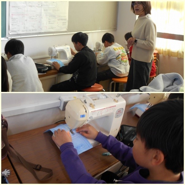 練習布でミシン縫いの練習をしていました。まっすぐに縫うこと、方向転換をして縫うこと、返し縫いをすることなど、基本の縫い方を身に付けています。スタートボタンを押すと緊張感が増します。さあ、初めてのミシン、上手に縫えたかな。