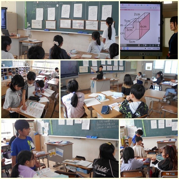 三角柱や円柱などの立体の高さがどこになるのかを学習しています。デジタル教科書の練習問題をいくつかやっていく中で、理解を深めていました。向きが変わっても見方が分かれば正しい答えが導けますね。