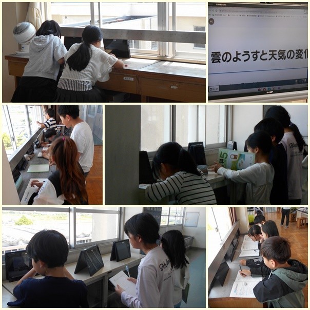 算数では、考え方をみんなの前で発表したり、友達にヒントを出して教え合ったりして学習を進めていました。理科では、雲の観察をしていました。タブレットを使って時間を追って観察をしています。