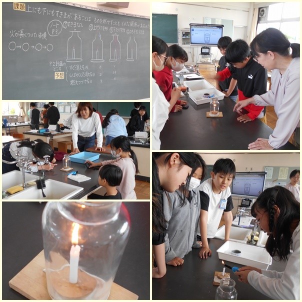 ものの燃え方について実験中。上下に隙間を作ったときと、隙間をふさいだときで燃え方に違いがあるのかを調べていました。さあ、結果はまとめられたかな。