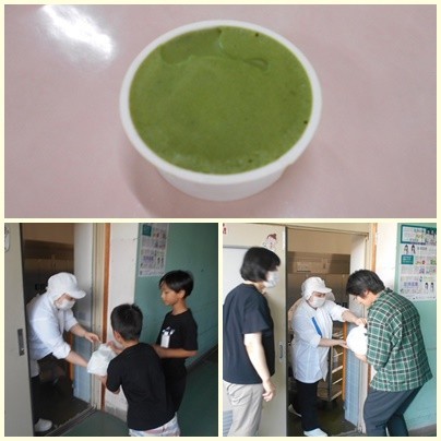 犬山産のお茶を使ったジェラートです。一緒に配膳すると溶けてしまうので、後から給食室に受け取りに行きました。とっても濃厚で、ミルクでまろやかさもあっておいしかったです。