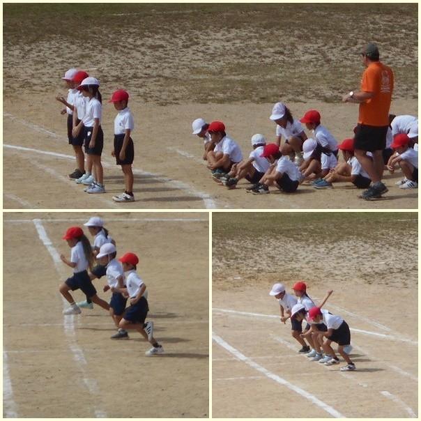 かけっこの練習です。待機線とスタートライン、そして、ゴールまでの距離を確認して全力疾走です。ゴールしたら、並ぶ場所まで移動します。自分の走る順番や並ぶ位置を確認しました。