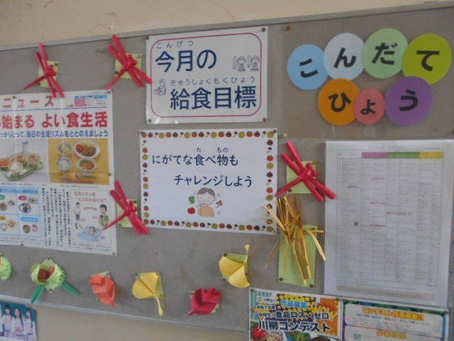 給食室の前の掲示板にも貼ってありますが、今月の給食目標は『にがてな食べ物もチャレンジしよう』です。食わず嫌いと言うこともあるかもしれません。調理法によっては食べられるものもあるかもしれません。苦手と決めつけず、まずは一口食べてみましょう。給食はいろいろな食べ物に出会えるはずです!