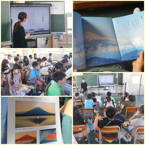3年生の音楽の授業では『富士山』の曲を学習しています。歌うときにイメージできるよう、歌詞にはどんなことが書かれているのかを確認していました。