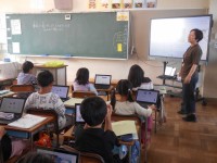 1年生がラインズさんによるプログラミングの授業をしています。自分でお絵かきした生き物が画面上の水族館で泳ぐという内容です。泳ぐ速さを変えることもできます。できたら、友達の作品も鑑賞します。操作の仕方...