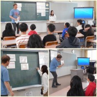 外国語の授業です。自分の名前を言うだけでなく、スペルも伝える練習です。先生のデモンストレーションを見てから、英語の名札を見せながらペアで会話練習をしました。
