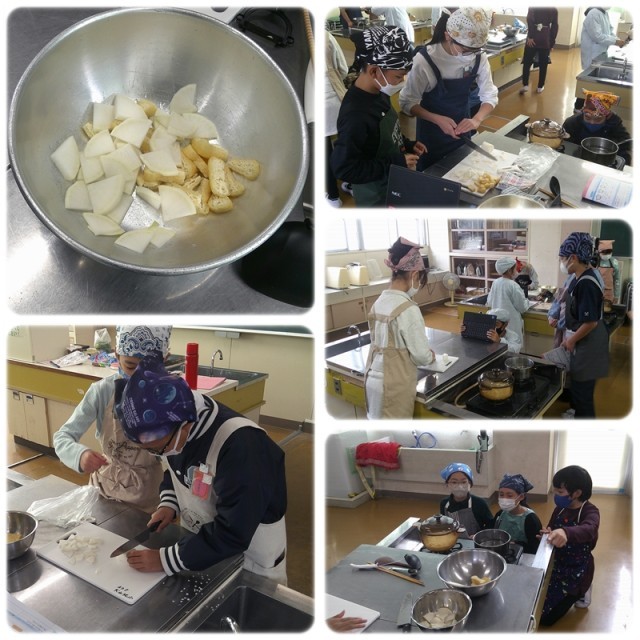 昨日に引き続き、3組が調理実習に取り組んでいます。
