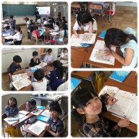 タックしき版画「たのしくうつして」に取り組んでいました。今日はいよいよ印刷でした。8色のタックを切り取って作った絵が、きれいに用紙に印刷されると大喜びでした。
