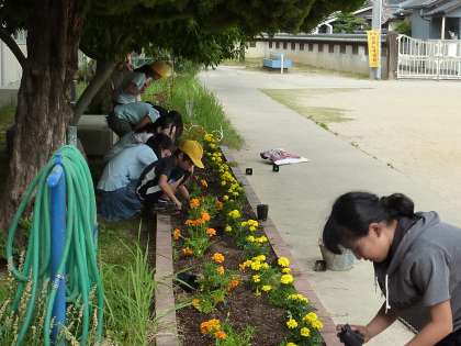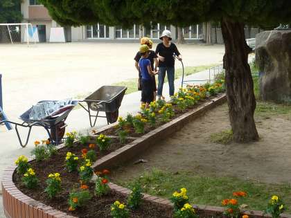 園芸委員会は、花壇の花を植え替えました。 マリーゴールドです。 玄関をきれいに飾ってくれますね。