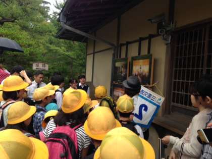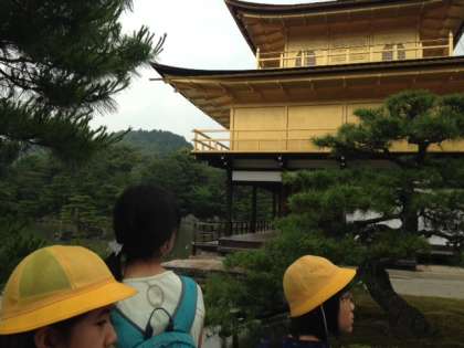 やっぱり美しいです。子どもたちも食い入るように見ていました。金閣寺の中は見えないので、写真とガイドさんの説明で学習しています。このあとは昼食会場に移動します。