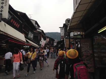 清水寺に向かう道の途中です。人混みの中で、遠くに赤いお寺が見えました。もうすぐです。