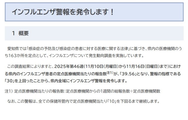 令和7年11月20日、愛知県内にインフルエンザ警報が発令されましたのでお知らせします。
